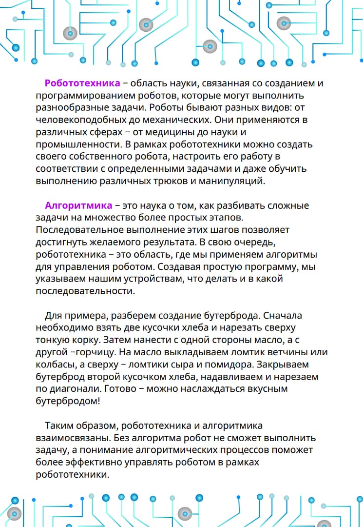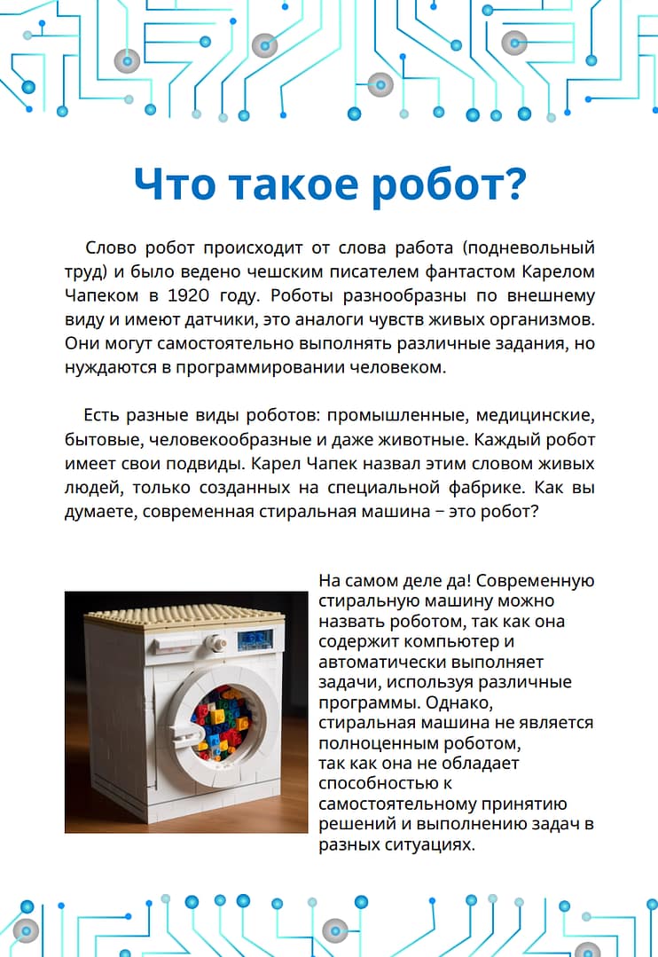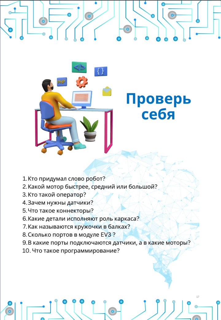 В рамках этой программы вы будите изучать основы робототехники – механику, датчики и программирование. Также вы соберете базовых роботов и закончите курс финальным проектом, где каждый ученик или вы создадите своего собственного робота. Необходимые материалы для прохождения курса предоставляются, а роботы будут собираться как в одиночку, так и в парах (если есть достаточное количество наборов). В конце каждого занятия будет домашнее задание, связанное с программированием и 3D-моделированием. Главная цель этого курса – познакомиться с робототехникой и предоставить базовое понимание в данной области.